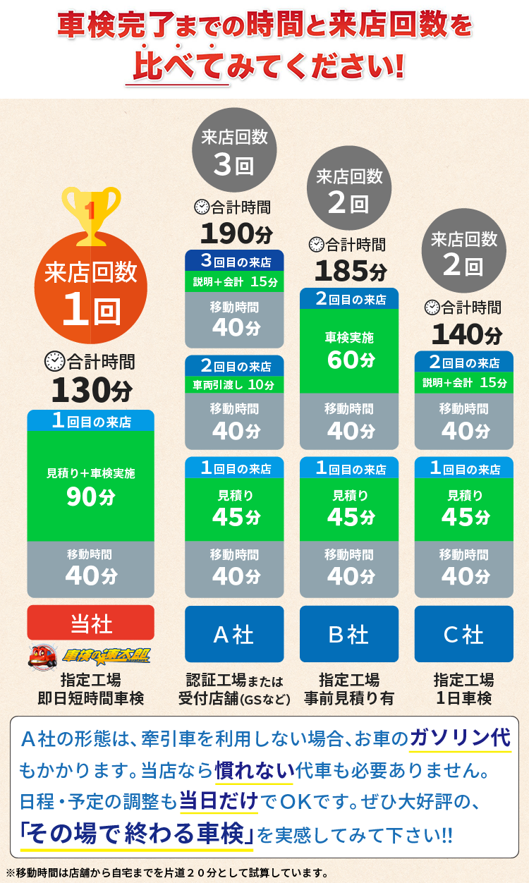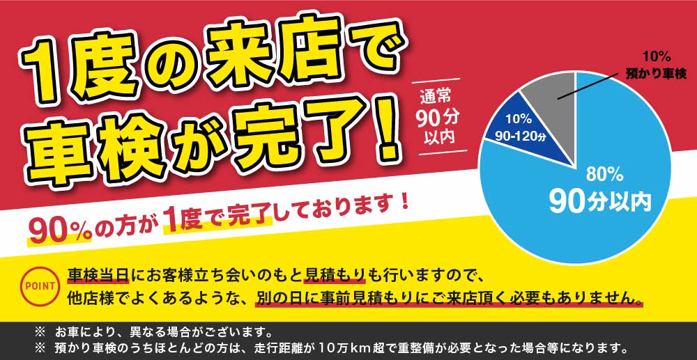 以前のように車検は何日もお預かりしなくても、通常90分で完了できるようになりました。