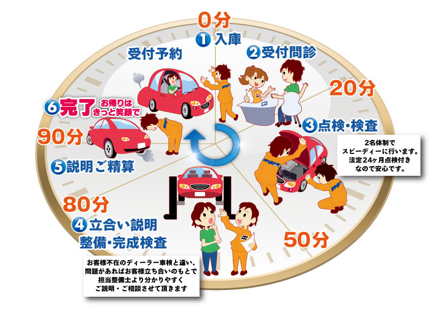 また通常90分の短時間車検の特徴として、点検終了時にお客様に実際にお車に立ち会って頂き、整備士から点検の結果についてのご報告をさせて頂きます。
